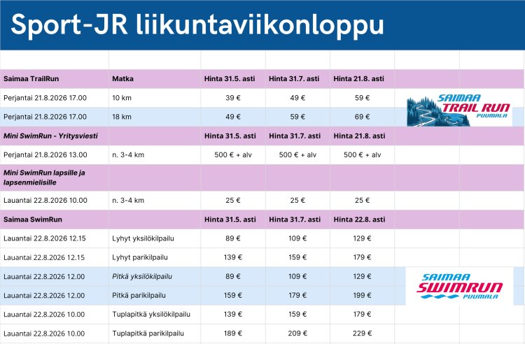 - Hinnat: 10 km: 39 €/49 €/59 € (hintaportaat 31.5./31.7./21.8. asti)